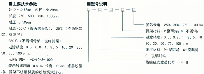 一能有效除去液体中的悬浮物、微粒等;一过滤孔径外大内小,具有优良的深层过滤效果;一有高的滤渣负荷能力;一多种材质满足各种液体过滤的需要;一滤芯有良好的相容性。 ■产品用途 适宜用于工业、生活用水过滤:润滑油、燃料油过滤:各种石化产品,如:环丁砜、贫(富)液等过滤:油漆、油墨过滤以及聚脂装置中C5~C10类过滤。 3、FN—II型聚丙烯折叠式滤芯 ■产品特点一滤芯材料全部为聚丙烯热合成型,无粘结剂,对生物无害;一过滤效率高,为99%以上;一阻力小,无纤维脱落;一非光敏性;一过滤面积大;一可杀菌消毒处理。 ■产品用途一石油工业:洗气用的胺、天然气、燃料油的过滤、提纯、油田井下注水过滤;一化学工业:有机溶剂、脂、醇及一般浓度的酸碱等化工原料的过滤;一食品行业:酿造用水的无毒过滤与澄清食用油的过滤,发酵罐空气过滤等;一医药行业:制备无菌水,口服液,各种输液针剂的终端过滤以及气体的除菌等等。 ■主要性能参数一过滤精度(um):0.1、0.2、0.45、1、2、3、5、10、30、60;一耐压(MPa):0.4;一最高工作温度(℃):80;一最高消毒温度(℃):120、0.1Mpa;一尺寸规格:内径—φ30mm;外径—φ65mm;—长度-250、500、750、1000mm。 ■型号说明示例:FN—III-5-1000-B表示:过滤精度为5 u m,长度1000mm,端盖为B型的聚丙烯折叠式滤芯。