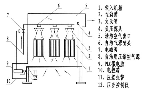 含尘空气在空气压缩机吸气侧负压的作用下,从粗过滤箱吸入,经过高效过滤筒,空气中的尘埃在重力,惯性扩散,接触阻留等综合作用下,被吸附在高效过滤筒上,而洁净的空气再经过特制的文氏管到净气室汇集至出气管被空气压缩机吸入。当空气被过滤后,尘埃被吸附在高效过滤筒上,在可编程序控制器的作用下,用自动的方式按顺序控制分组进行反吹自洁过程,当阻损超过一定值时,用自动方式进行连续反吹自洁,程序设计中也可用手动自洁方式反吹,直以阻损保持在指标内即恢复原来的自动自洁程序。
