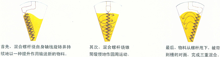 一食品工业:小麦粉、谷物、奶粉、香料、咖啡、味精、食盐等的混合物。一干燥行业:粉料的干燥。一化工工业:药品、化妆品、洗涤剂、涂料、树酯、玻璃硅、颜料、塑料、添加剂等行业的混合。 性能特点 一该机适用于固(粉)—固(粉)(粉体粒度300~2000um)混合及固(粉)—液(含液量<15%)的混合,特殊的夹套装置,还可作为干燥设备使用。一独有的双级双轴输出的减速机,使本机结构紧凑,外型美观,操作方便;一锥形简体以恰到好处的锥度确保物料流动形式及方便迅速出料,无滞留;一设备内部结构设计匠心独具,始终保证单螺旋产品运行可靠,维护方便;一混合速度快,一般粉体混合只需10分钟左右;一手动、电动、气动出料方式供你选用。
