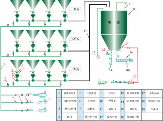 二、原理及特点: 原理: PSG系列气固喷射器,以离心风机(空压机、罗茨风机)为动力气源,运用气固两相流原理,以流态化技术,射流技术和压差原理相结合,以电动旋转供料器为供料装置,将物料送入料气混合室,物料在料气混合室流态化的同时,利用双环状喷嘴产生的高速气流将物料送入加速室,以悬浮流进入输送管道,利用气力压差将物料沿管道送入受料仓内。料气分离,经布袋除尘器过滤后将气体排入大气。 特点: 1、投资省、运行成本低、节能明显 由PSG系列气固喷射器组成的低压连续输送系统,不仅在工程造价上体现其投资省、而且运行成本低。由于无进出料及排气阀门,无易损件,因此运行费用低,同时使用低压输送比空压机系统输送要节约能耗30%左右。 2、操作方便 该设备本体控制只有电动旋转供料器和进气阀,则设备本体控制只需“启动”或“停机”操作,设备运行只需巡视,不需要人工值守。由于连续泵工艺系统简单,所配置的控制系统也相应简单。根据系统配置,既使采用PLC控制系统,如发生故障,具有报警系统,也可手动控制,不影响系统的正常运行。 3、设备及管道磨损小、使用寿命长 由于采用低压输送,设备及输灰管内流速较低,输送浓度恒定。因此,系统设备和管道磨损小、使用寿命长。 4、系统布置方便灵活 由于该设备体积小,安装高度较低,因此在系统布置时方便灵活,可完全满足工程布置需要。 5、对气源的品质要求不高 连续泵动力气源,一般采用离心风机或罗茨风机和压缩机,无需设立空气净化系统。根据系统设计,只对风量和压力有一定的要求。根据情况也可使用压气站气源。 6、系统可靠性高 ①PSG系列气固喷射器采用离心风机或罗茨风机和压缩机为动力气源,由于风机的高性能决定了系统的运行可靠性。 ②PSG系列气固喷射器组成的气力输送系统,在现场灰量允许的条件下,可采用两个灰斗共用一台泵的布置方式,一般设备数量少,使得整个系统简洁可靠。 ③PSG系列气固喷射器料气比稳定,无任何冲击负荷,无常规气力输送工艺中的阀门频繁动作,设备故障率大大降低。 三.、典型系统工艺流程 1、典型工艺流程一