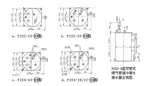 2、示例:煤气管道最大压力为32000Pa,接管通径DN150,应选型号:P2S4-40-150,其中数字“40”为水封高度。